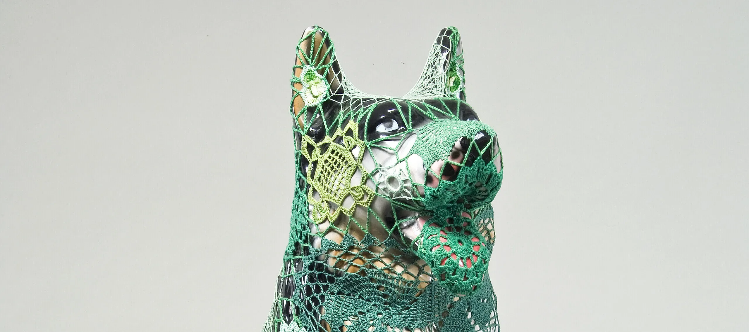 Vasconcelos’s works in Revival question viewers’ assumptions about nature. She presents large, mass-produced forms of a German shepherd, an enlarged snail, and a larger-than-life wasp—their forms covered in patterned lace. Rather than simply delight viewers, the over-sized representations of these creatures unsettle, startle, and even frighten the viewer. The intricate crochet encasing them raises more questions. Does the lace protect or imprison these animals? Does lace adorn the creatures or hide something treacherous about them?