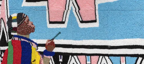 Clark’s depiction of Mahlangu’s touch hints of the divine. The concentric circles from the tip of her brush give the impression that the image she paints comes magically into sight. Clark further links the work with that of other innovative Ndebele artists, as women in the communities are the sole designers and creators of beadwork. Their use of symbolic geometric patterns and colors often comment on an individual’s age, social class, and status. Beaded garments, jewelry, and textiles can communicate messages of affection, marital relationships, and spiritual protection.