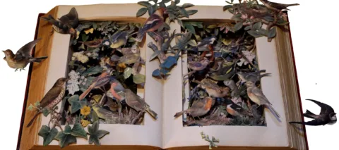 Bursting from the confines of a textbook’s binding, the winged creatures in Britain’s Birds and Their Nests embody carefree liberation. The viewer can almost hear the cacophonous sounds issuing from their open beaks.