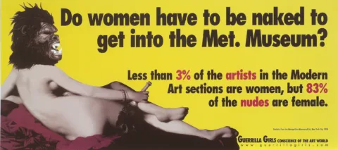 The Guerrilla Girls were invited to participate in “Always A Little Further,” an exhibition curated by Rosa Martínez, co-director of the 2005 Biennale. The Girls created six seventeen-foot posters addressing gender discrimination in Hollywood, Bush administration policies, and the art world in general, but, of course, not even the Venice Biennale itself escaped their criticism. They approached these topics through their typical tactics of shock value and humor, buoyed by factual information and statistics. At NMWA, the Biennale posters are represented with smaller prints.