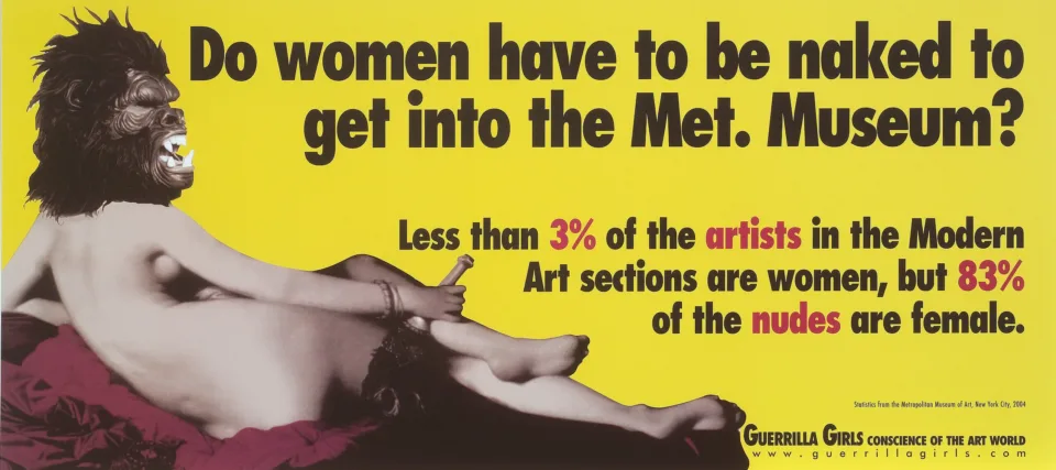The poster above addresses the Biennale’s racial and gender deficiencies. The Girls appear as picketers in front of a Canaletto painting of the Doge’s Palace. Their signs draw attention to the historical scarcity of women with solo exhibitions, group shows, and leadership roles in the Biennale. They also take on the underrepresentation of African countries in national pavilions.