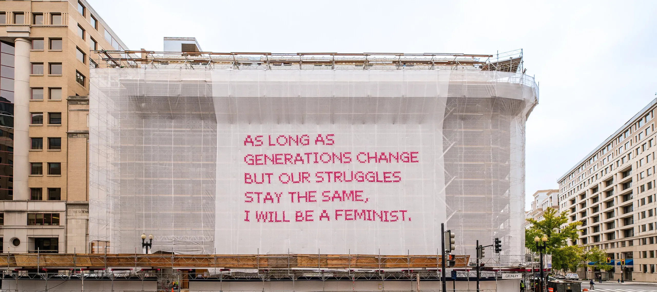 With her team, Austrian artist Katharina Cibulka developed the series “SOLANGE” (German for “as long as”) and created a large-scale work now on view on the museum’s façade that reads, “As long as generations change but our struggles stay the same, I will be a feminist.” In this series, monumental nets are cross-stitched with tulle and cable ties on construction scaffolding. Their messages raise awareness and voice the continued need for feminist action.