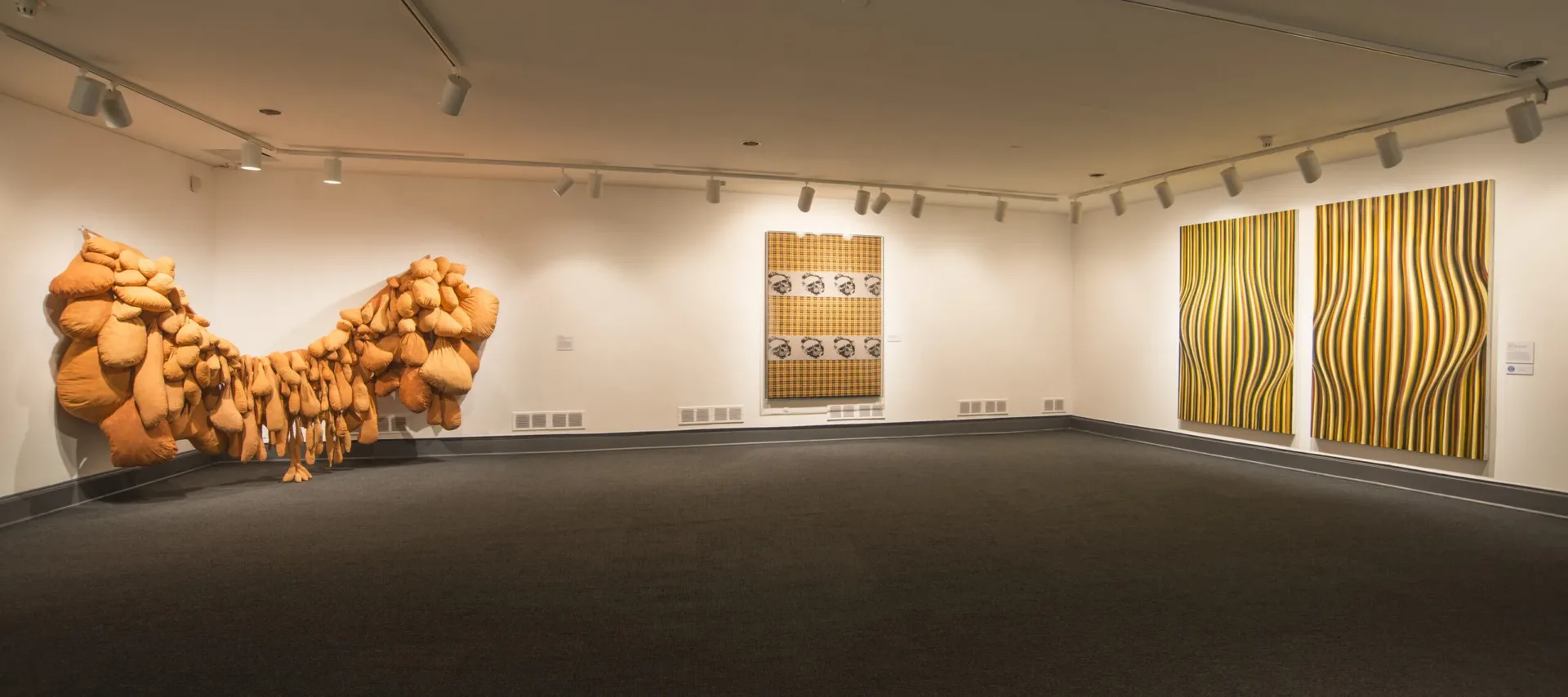 An installation view of a gallery space with white walls and a gray floor. There are several art pieces hanging on the walls. On the left, a huge textile piece made of several bags in an orange fabric takes up a big part of the room. Another art piece shows skulls on an orange checkered background. On the right wall is an abstract art piece made of several orange, white, and black stripes that causes an optical illusion.