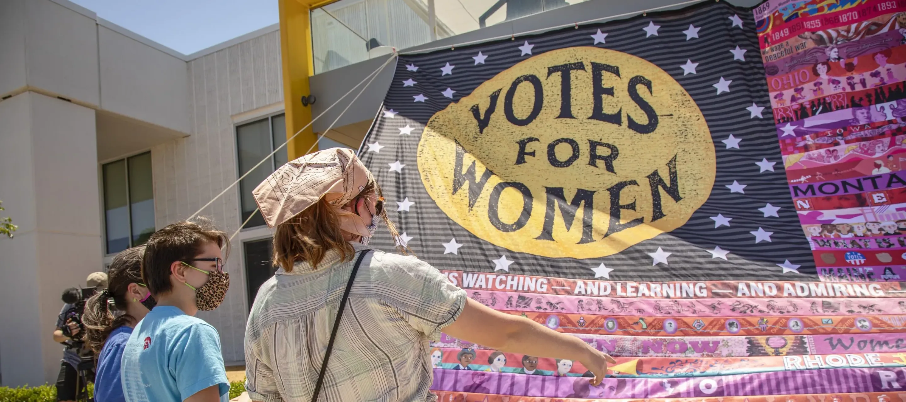 The artists represent diverse ages and ethnicities, and they explored a variety of subjects. Many depicted notable women from the suffrage and civil rights movements. Others created scenes that reference the fact that the 19th Amendment did not ensure access to the ballot box for all women. Struggles faced by Native American, Asian American, Latinx, and African American women lasted well beyond 1920, and some continue today. Several stripes portray contemporary women and girls, highlighting the legacy of the suffrage movement in today’s social justice activism. “Reflecting upon this milestone gives us an opportunity to remember that partial progress is not total progress and that we must always continue to seek equity and equality,” says Artus.