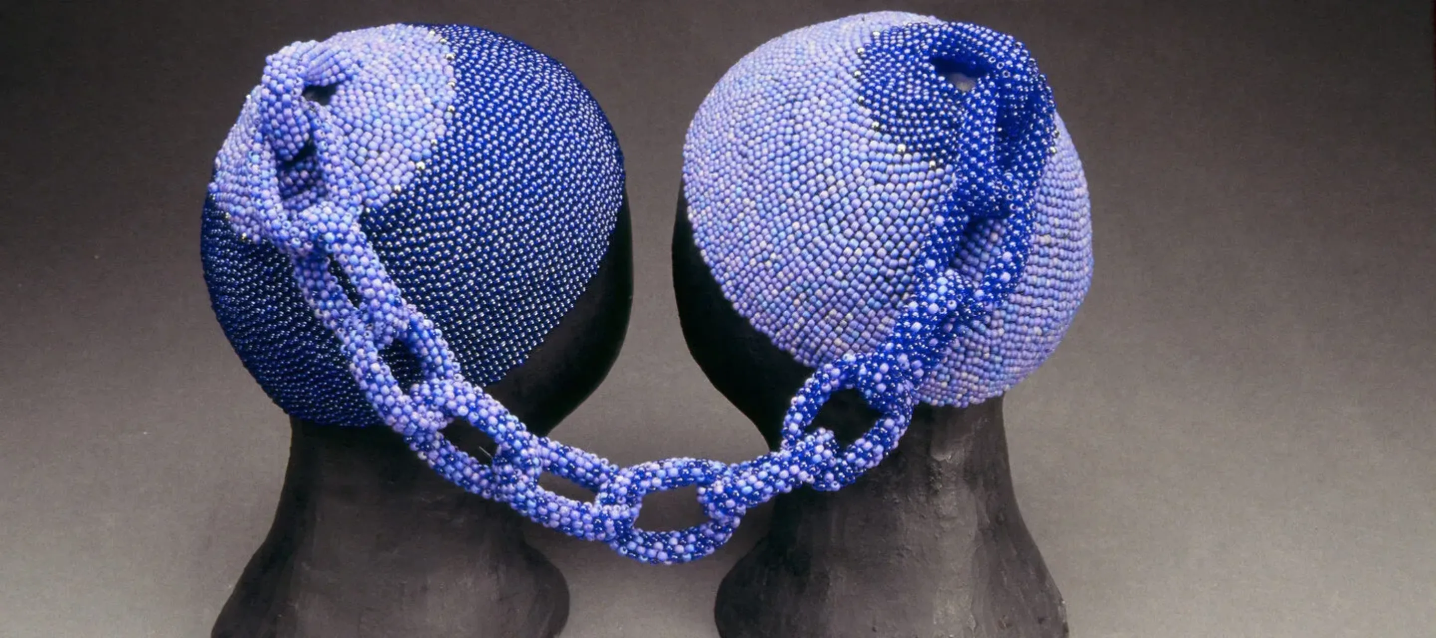 Intricately woven and beaded headpieces, among Clark’s earliest works from the 1990s, interpret African customs of adornment. Built from thousands of tiny, glimmering glass spheres, other beaded sculptures depict hands, outstretched arms, and chromosomal strands, ethereal manifestations of familial and ancestral bonds.