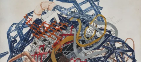 Several artists in Positive Fragmentation address the built spaces we inhabit. Nicola López (b. 1975) and Sarah Morris (b. 1967) both use the urban environment and its architecture, whose elements, beams, girders, sheathing, wiring, they distill and rearrange to emphasize the visual interest of individual components as well as the unseen social forces that support, or destabilize, the city environment.