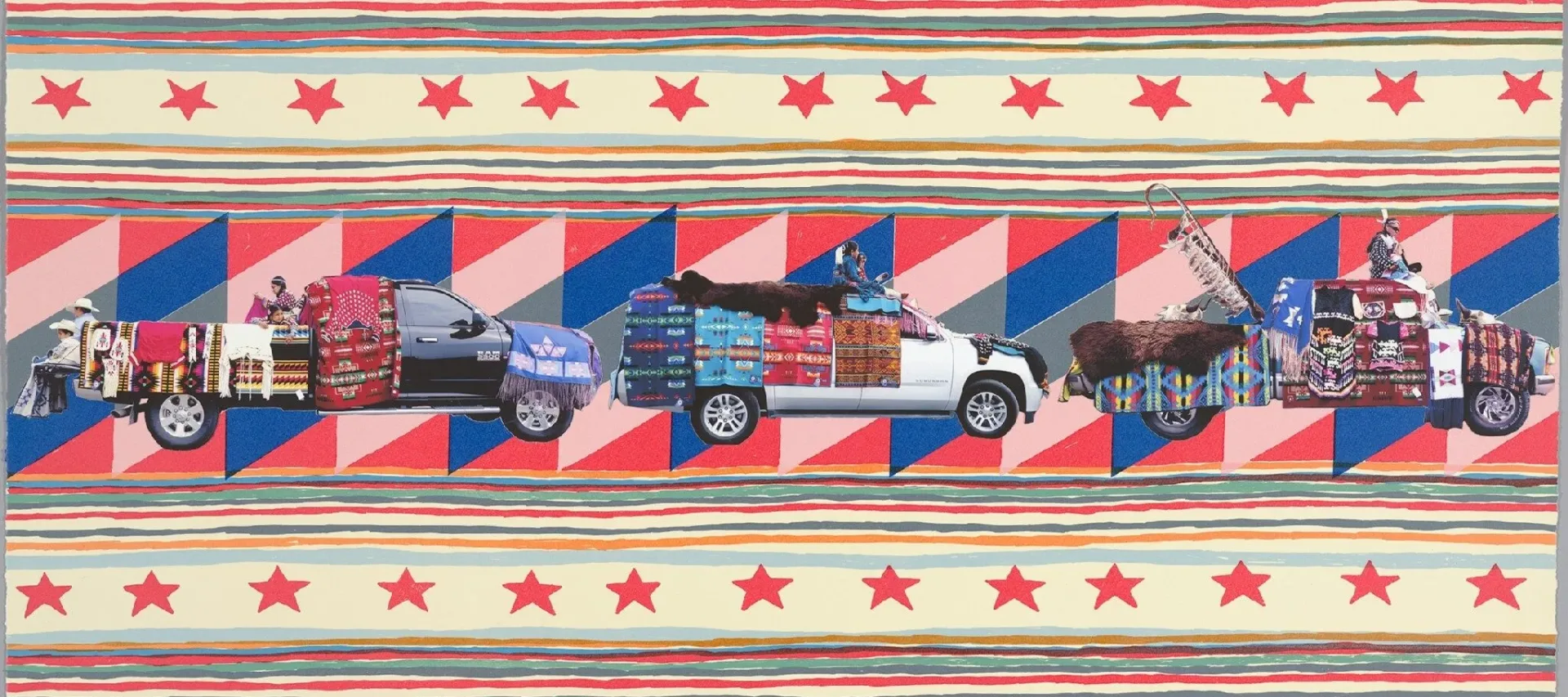 The history of these blankets is inextricably linked to Native communities, and they have become objects of prestige and ceremonial importance. Together with the distinctly American-made cars and trucks that are often decorated for parade as horses would be, Red Star’s images embody what Lippard observed about the collage aesthetic being a means for “putting things together without divesting them of their own identities.”
