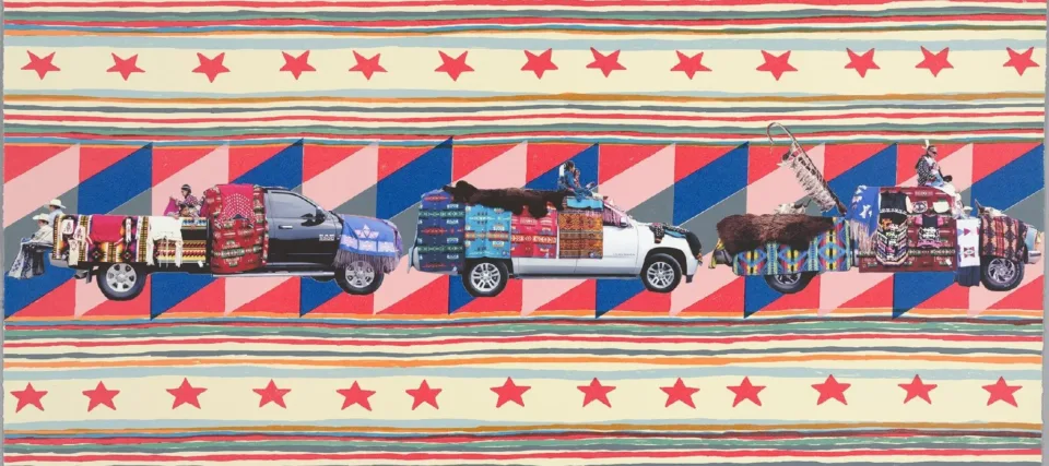Similarly, photo montages by Wendy Red Star (b. 1981)—iilaalée = car (goes by itself) + ii = by means of which + dáanniili = we parade (2015–16) and Yakima or Yakama—Not For Me To Say (2015), combine elements to honor the histories of Indigenous American tribes and reflect the ingenuity of the present. Photographs of cars decorated for Crow Fair, an annual gathering of Great Plains tribes, are superimposed on geometric backgrounds whose designs are taken from Pendleton blankets. Although the company was founded by and is operated by Anglo-Americans, Pendleton blankets incorporate designs based on traditional motifs taken from many Indigenous cultures.