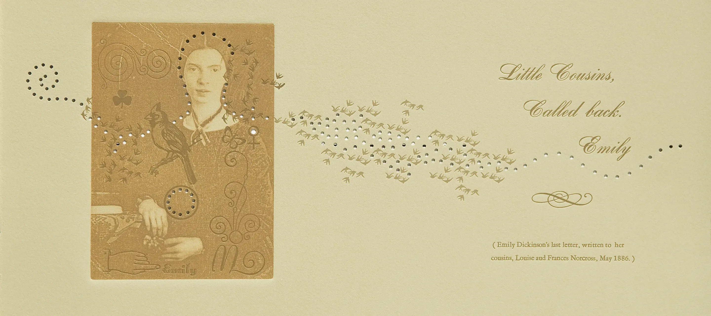 Since the discovery of almost 1,800 poems after her death in 1886, readers and artists alike have studied, adopted, and celebrated the work of Emily Dickinson. As noted by poet and essayist Adrienne Rich, Dickinson’s work remains relevant in its focus on the feminine and the interior, in the literal sense of the domestic realm and, metaphorically, in the expression of the inner self. Five works in the Betty Boyd Dettre Library and Research Center’s exhibition Power in My Hand: Women Poets, Women Artists, and Social Change testify to the enduring legacy of Dickinson’s work.