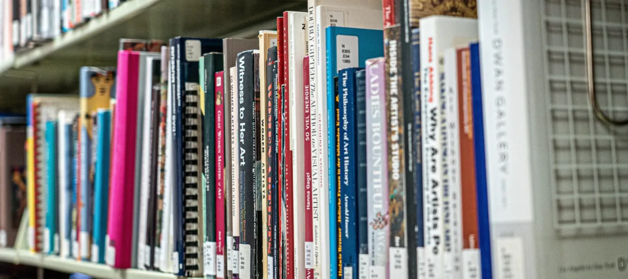 A bookshelf packed with colorful books about women artists.