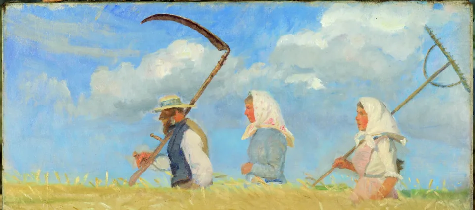 However, Skagen’s beach also became a place of leisure and recreation after an increase in tourism in 1890. Michael Ancher’s A stroll on the beach perpetuates this idealized view of Skagen life by showing middle-class women enjoying the bucolic setting. Furthermore, sea views were not the only nature scenes worth depicting. Skagen also had fertile fields where farmers grew a variety of grains.