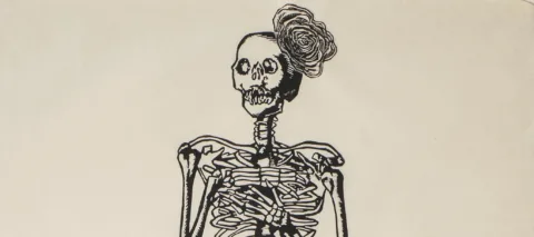 Audrey Niffenegger’s works explore the world of the unconscious mind through dreams and fantasies—within NMWA’s exhibition Awake in the Dream World, many of these pieces are gathered in a gallery called “In Dreamland.” The “Dreamland” works tell unusual and interesting stories where morbidity, romance, and humor intermix. Niffenegger confronts themes of mortality and the passage of time in an attempt to startle her viewers into appreciating “the fleeting nature of our selves.” Skeletons feature prominently in these macabre images: Niffenegger describes the cadaverous figures as a part of a “vocabulary for expressing ideas about permanence and the ephemeral.”