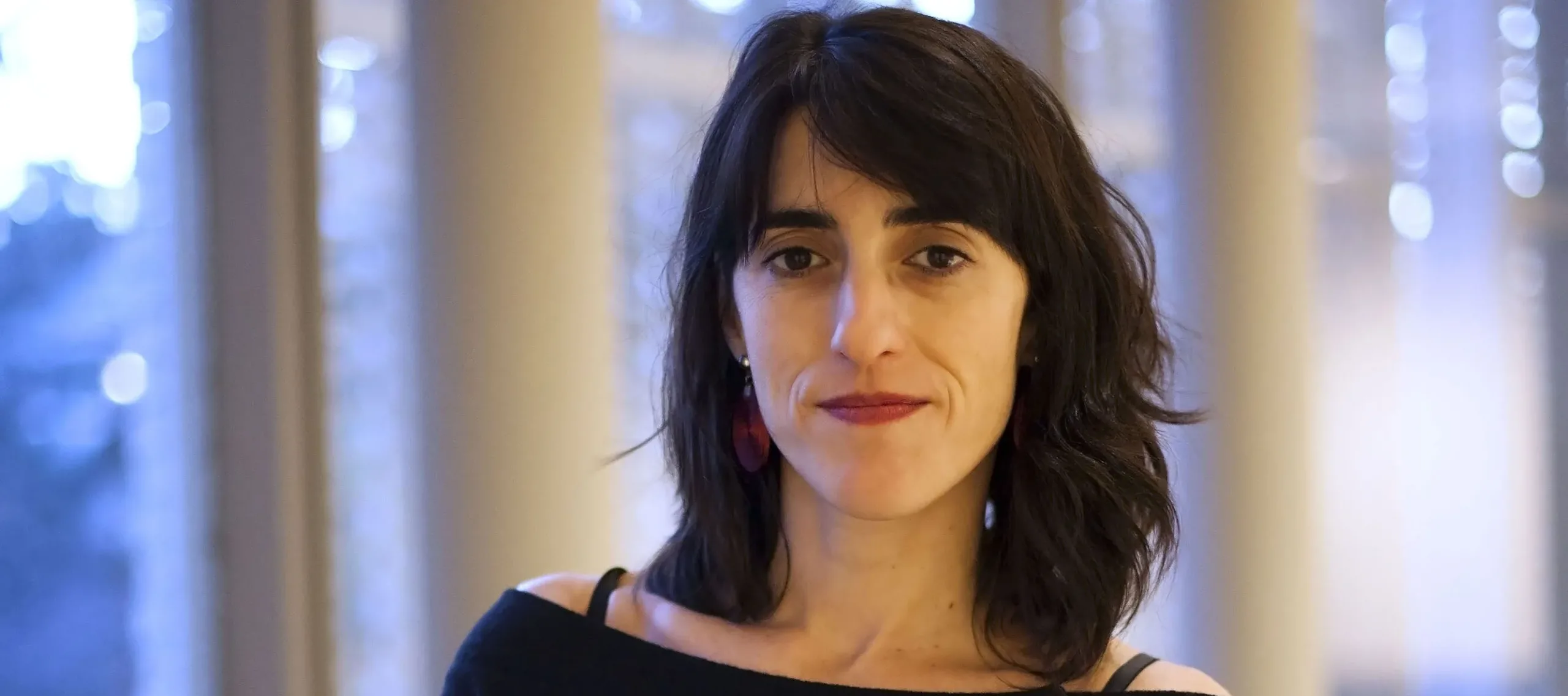 A light-skinned woman wearing a black shirt and red plaid skirt stands with her arms crossed, leaning against a table and smiling slightly.