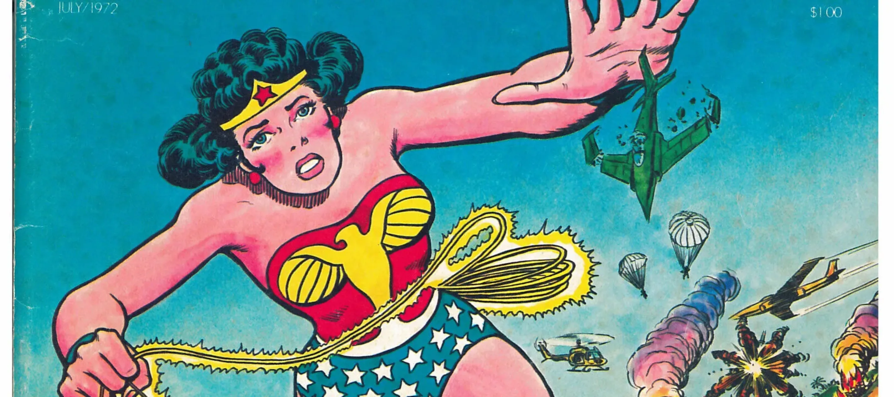 The illustration was by Murphy Anderson, a longtime artist for DC Comics. The banner “Wonder Woman for President” likely references Congresswoman Shirley Chisholm’s bid for the Democratic Party’s nomination for president that year. Anderson also reflects the country’s anxiety about the war in Vietnam as a giant Wonder Woman strides with urgency down a main street in America, rescuing part of the town with her golden lasso, while shielding the street from a raging jungle battlefield placed uncomfortably close behind the shop fronts.