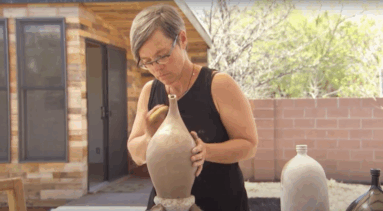 She engages with and adapts shapes that some might consider unattractive. Some of her vessels look like the disposable plastic bottles they reference. Others resemble classical urns, Pueblo pottery, or modernist sculpture. Some evoke organic associations, bringing to mind gourds, organs, birds, or mutants.