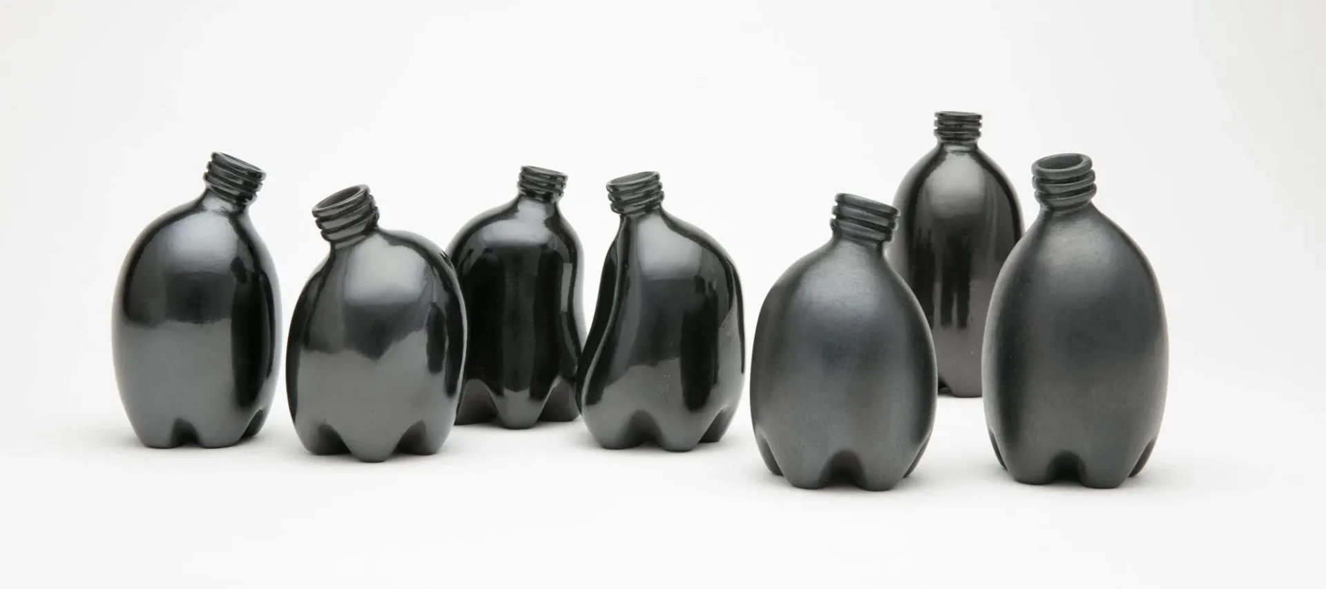 Border Crossing presents recent work by Albuquerque-based artist Jami Porter Lara (b. 1969), who hand-builds and pit-fires clay sculptures resembling a ubiquitous icon of modern life—the plastic bottle. Finding both ancient pottery shards and recently discarded plastic bottles along the U.S.–Mexico border inspired Porter Lara to reconsider the bottle as a “contemporary artifact.”
