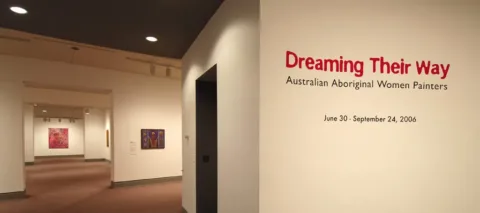 Dreaming Their Way: Australian Aboriginal Women Painters is a groundbreaking exhibition of art by 33 indigenous Australian women. The first of its kind in the U.S., the exhibition presents over seventy works of art, from intensely colorful canvases to intricate bark paintings, all demonstrating women’s bold and often experimental representations of their heritage. Many of the paintings are simply exhilarating, with their bright colors, complex compositions, and sheer joy that seems to emanate from the canvas.