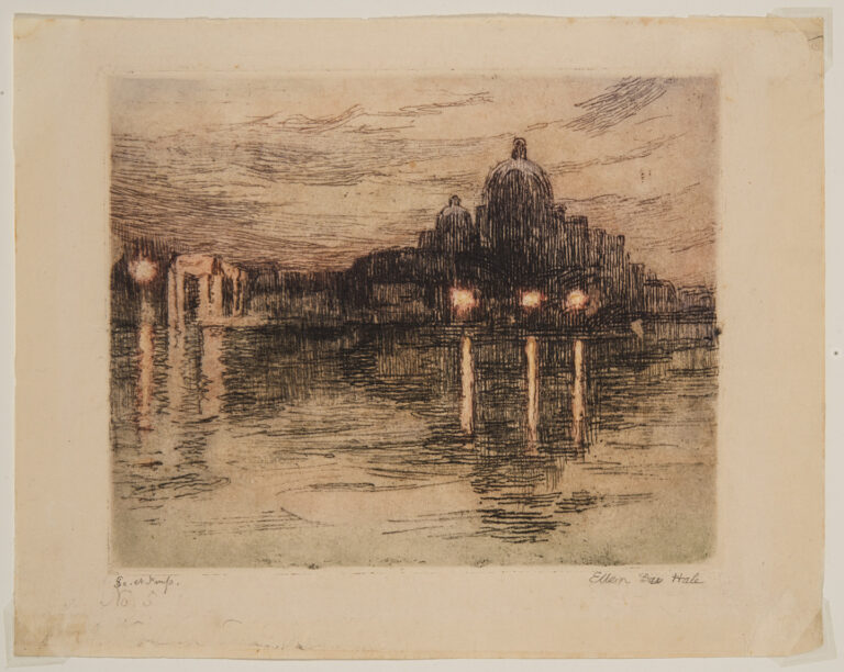 Hale later trained in the ateliers of Boston artists and traveled to Paris in the early 1880s to study painting. While abroad, Hale published accounts of her studies and the Parisian art world in the newspaper Boston Traveller, encouraging female artists in Boston and inspiring them to travel. She documented her own “jauntings about the world” through etchings, a printmaking technique she learned from fellow artist Gabrielle de Veaux Clements, her lifelong companion.