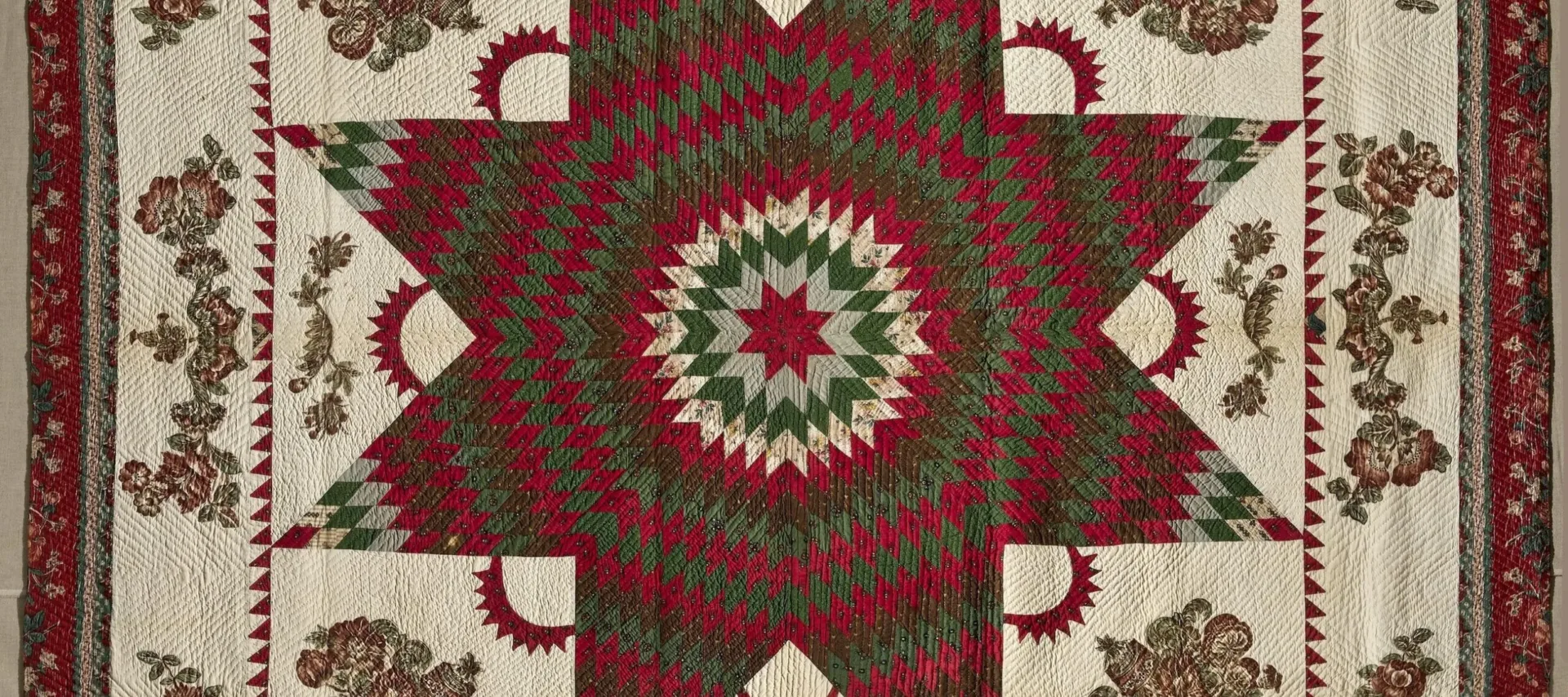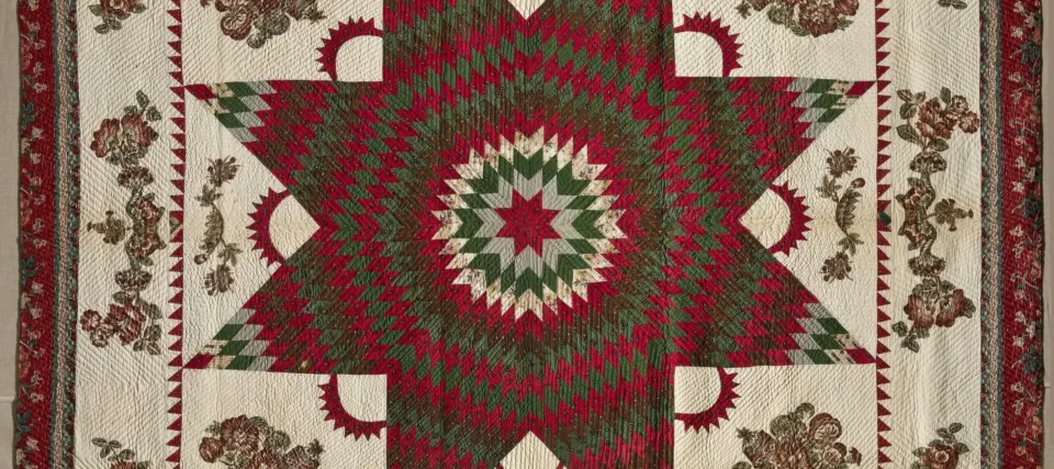 Spanning two centuries, “Workt by Hand” features examples of iconic quilting designs and techniques, including the “Log Cabin” style, “Double Wedding Band” designs, Amish “Sunshine and Shadow” style, album quilts, and “crazy quilts.” Within thematic sections, the exhibition emphasizes the intriguing and ever-changing interpretation of quilts.