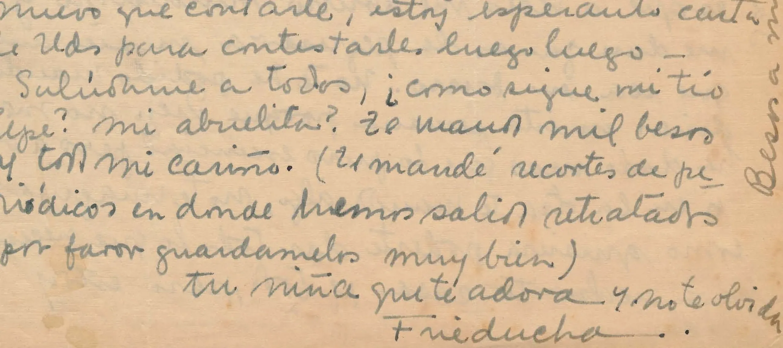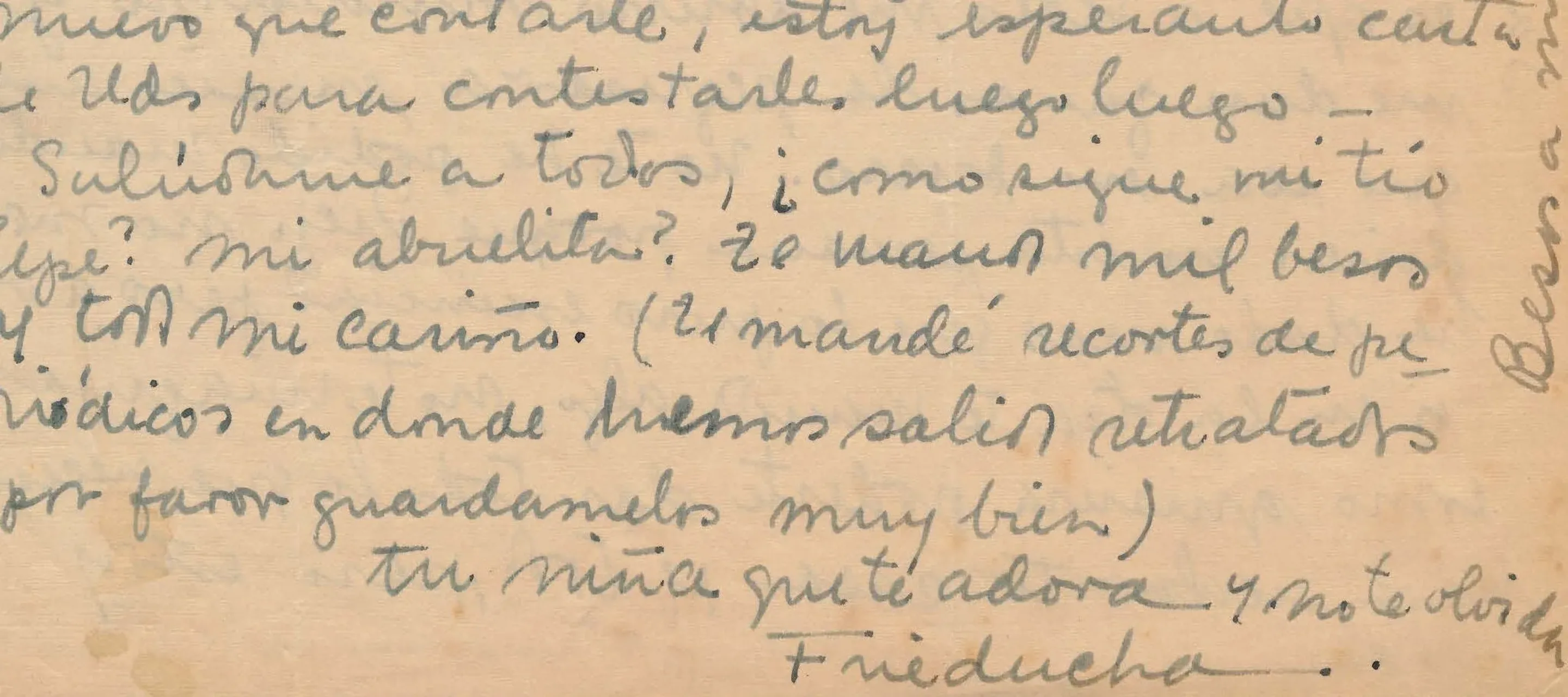 Mi abuelita? (Te mando mil besos y todo mi cariño. (Te mandé recortes de periódicos en donde hemos salido retratados por favor guárdamelos muy bien).