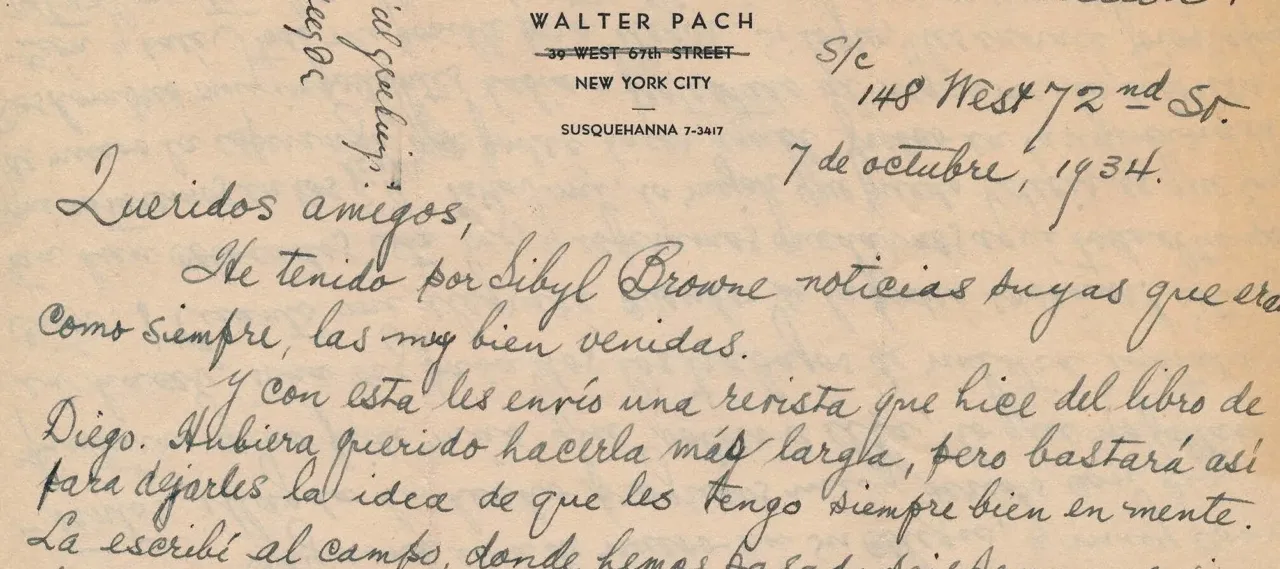 This is a letter from Walter Pach (1883 to 1958), an American artist, critic, curator, and teacher. Pach helped bring the Armory Show to New York in 1913. In the early 1920s, Pach visited Mexico and was impressed by the work of Diego Rivera, Frida Kahlo, and other Mexican Modernists. He became a longtime friend of Kahlo and Rivera.