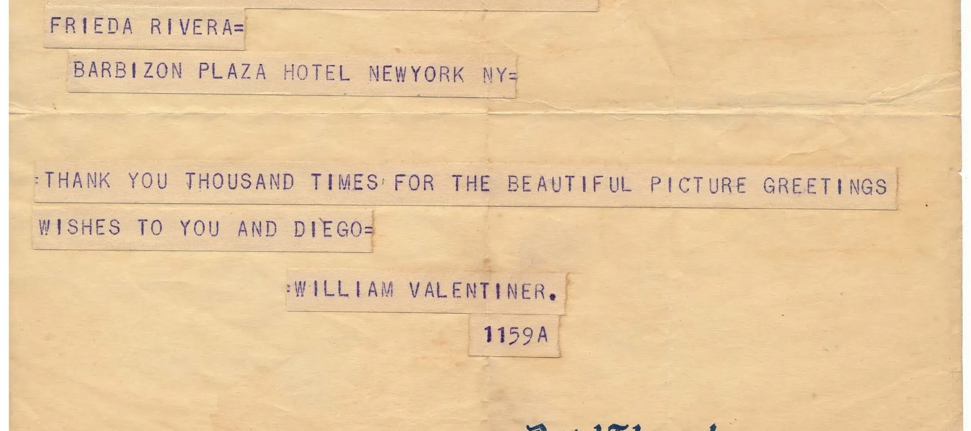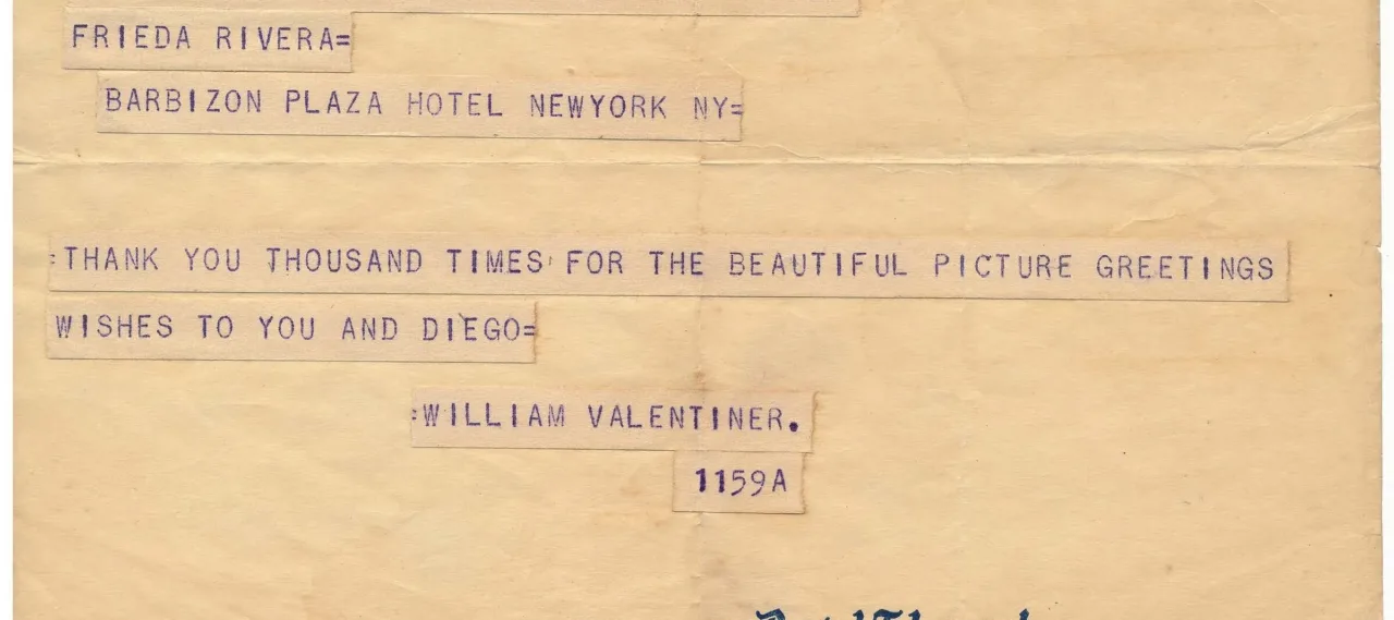 ![Telegram on yellowed paper with typewritten text in blue and blue letterhead. The letterhead has three distinct sections: in the center, there's a graphic of the globe in an inverted triangle, on the left is a box with preprinted information with receipt information rubber stamped in, on the right is a box with the following preprinted information: POSTAL TELEGRAPH, THE INTERNATIONAL SYSTEM, [Box with preprinted information] This is a full rate Telegram, Cablegram or Radiogram unless otherwise indicated by signal in the check or in the address. DL DAY LETTER NL NIGHT LETTER NM NIGHT MESSAGE LCO DEFERRED CABLE NLT NIGHT CABLE LETTER WLT WEEK END CABLE LETTER RADIOGRAM](https://nmwa.org/wp-content/uploads/2025/02/Folder-191-Valentiner-William-1933-5.6.1933-telegram-e1740568587281-768x577.jpg)