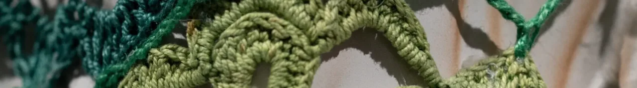 Close-up detail of a larger artwork shows an off-white ceramic surface that is covered by panels of crocheted yarn in emerald and citron green.