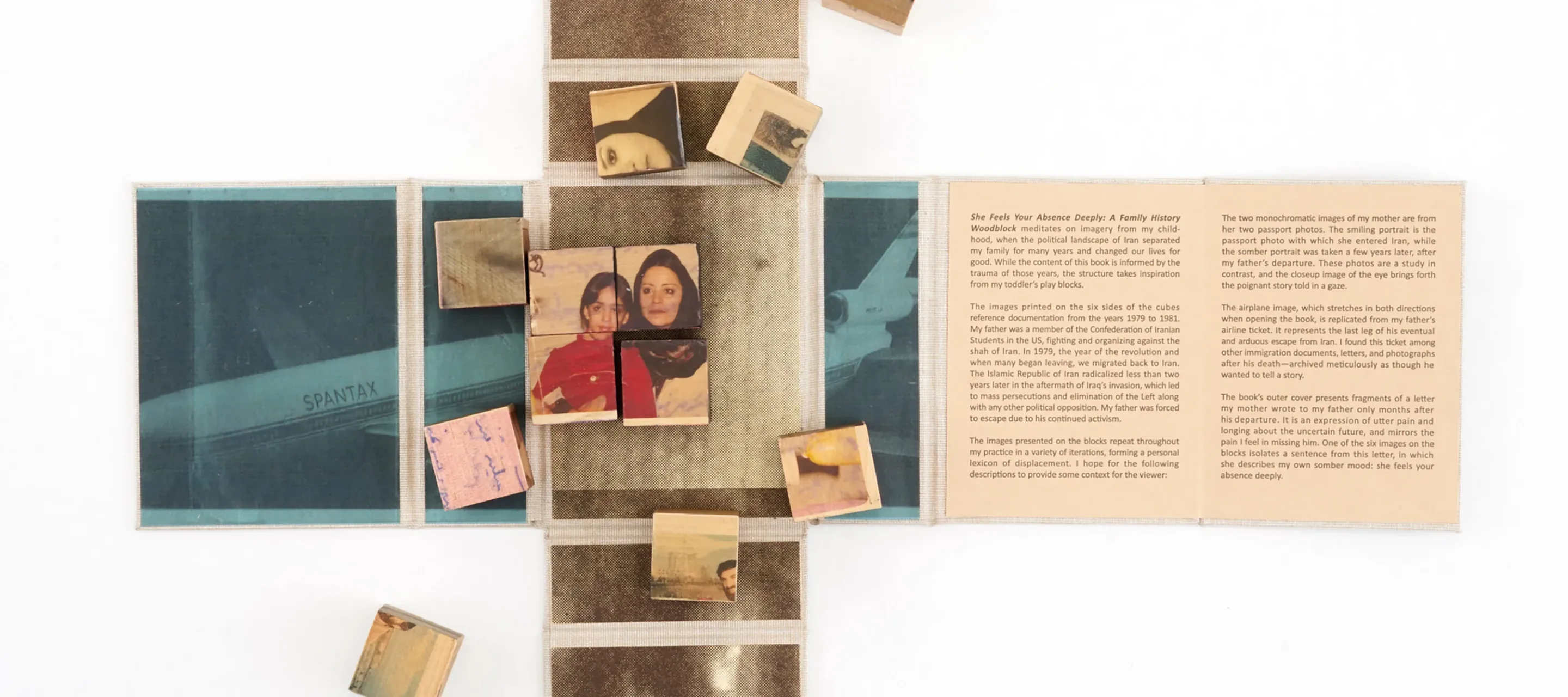 Among artists’ books on view created by more than 20 artists, highlights include Golnar Adili’s She Feels Your Absence Deeply (2021), in which archival letters and photos relating to her family’s life in Iran and escape from persecution are printed on six-sided cubes that can be mixed and matched, like a child’s puzzle. The cubes are housed in a box printed with the image of her father’s airplane ticket out of Iran. When the box is closed, it hugs the blocks, keeping them safe until the visual story unravels again.