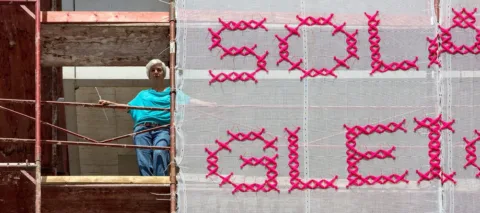 In bright pink tulle on white mesh fabric that covers construction scaffolding, Cibulka (b. 1975, Innsbruck, Austria) cross-stitches poetic and witty declarations such as “As long as the art market is a boys’ club, I will be a feminist,” “As long as he makes the cash while I work for change, I will be a feminist,” and ”As long as women’s power is an underrated energy source, I will be a feminist.” For each of Cibulka’s site-specific “SOLANGE” works, the artist considers the local environment and community while developing the phrase for that location. She seeks public input to understand the concerns of community members and neighbors—previous statements have addressed topics such as income inequality, family structures, the abuse of power and the art world. Cibulka’s work at NMWA—unveiled during the October opening—will reflect the museum’s mission and resonate with neighbors in Washington, D.C., as well as the museum’s broader network of members, supporters and friends.