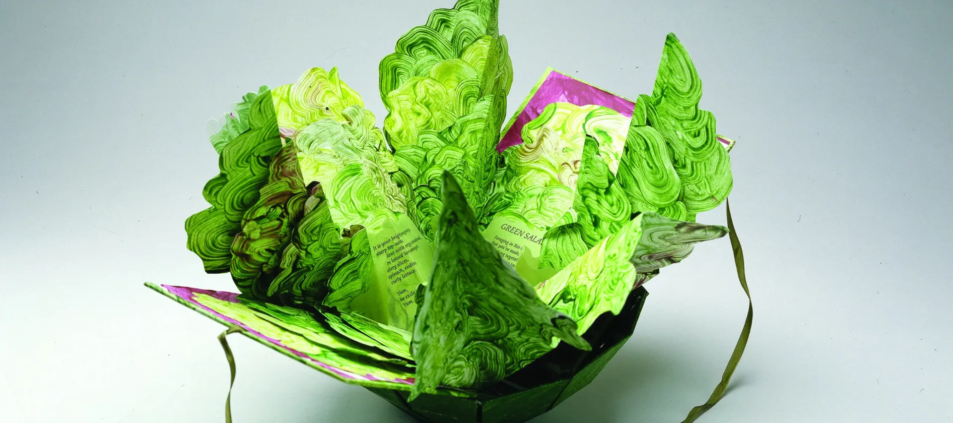 Although Wasserman procured exquisite texts made through the time-honored processes of printing and binding, Bound to Amaze centers on her discovery of books that incorporate inventive techniques such as piercing, pleating, curling and tying. A number of featured works are dramatically sculptural in form, made from materials including linen, wood and semi-precious stone. Accordion book structures, such as Dido and Aeneas (1989) by Claire Van Vliet (b. 1933), unfold to reveal all of their drama simultaneously. Green Salad (2001) by Katherine Glover (b. 1947) comprises a wooden salad bowl filled with green leaves of paper and a poem about the artist’s son nestled inside the leaves.