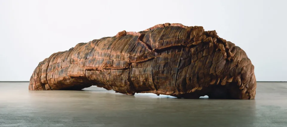 While von Rydingsvard’s signature medium is cedar wood, her oeuvre includes continued exploration and experimentation with unusual materials. Her works often suggest corporeal or beast-like forms and even incorporate animal entrails and other organic materials. In Ocean Floor (1996), the perimeter of the large wooden vessel-like structure is encircled by pouches made of sewn cow intestines and filled with peat moss. Large sheets of intestinal membrane in Untitled (stacked blankets) (2014) reveal veins branching across the translucent, fragile surface, eliciting a visceral response from the viewer.