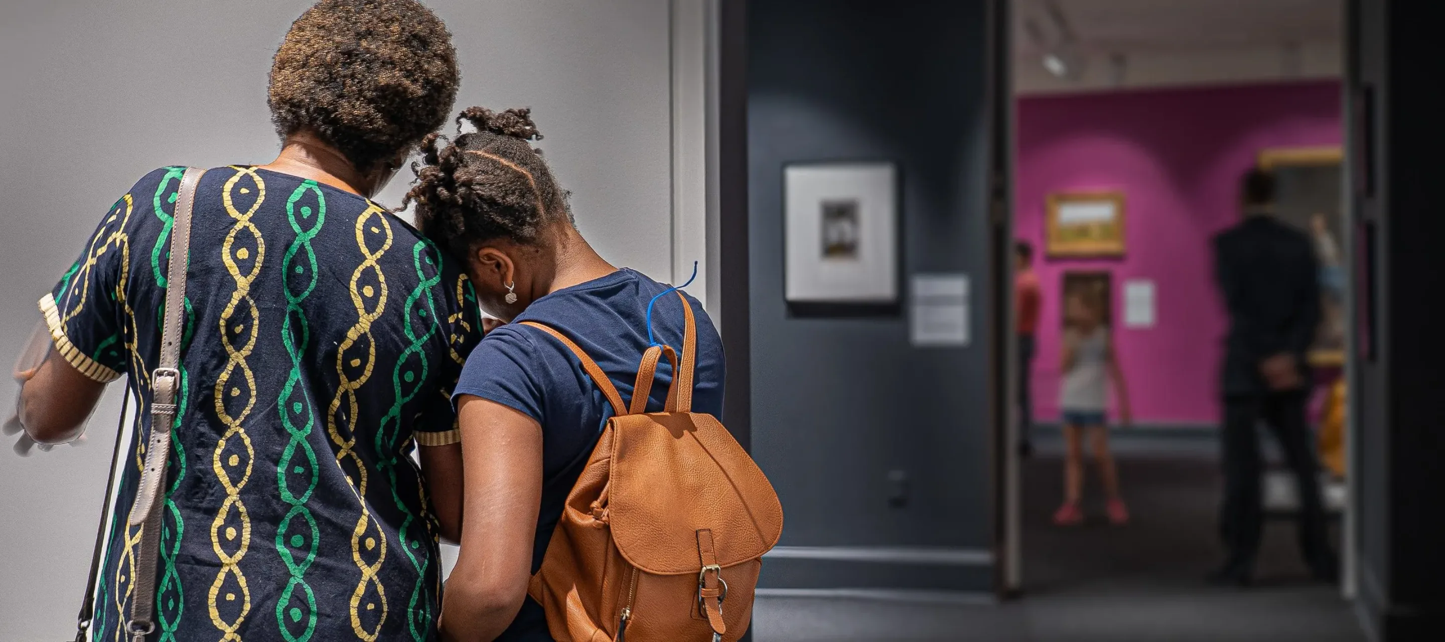A middle aged, medium dark-skinned woman and a school age medium dark skinned girl face away from the camera and lean into each other affectionately while viewing artwork.