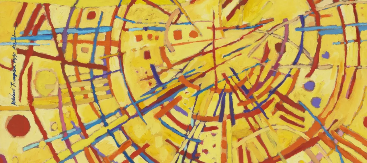 Abstract painting features a vivid yellow background covered by circles, daubs, and straight and wavy lines in red, orange, cobalt, sky blue, and violet. Arcing red strokes evoke concentric circles. Straight lines in other hues radiate out from the center circle like a starburst.