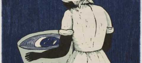A woodcut print shows a barefoot Black woman from the back at a slight angle holding a washtub. Her face is visible only via the reflection in the tub water.