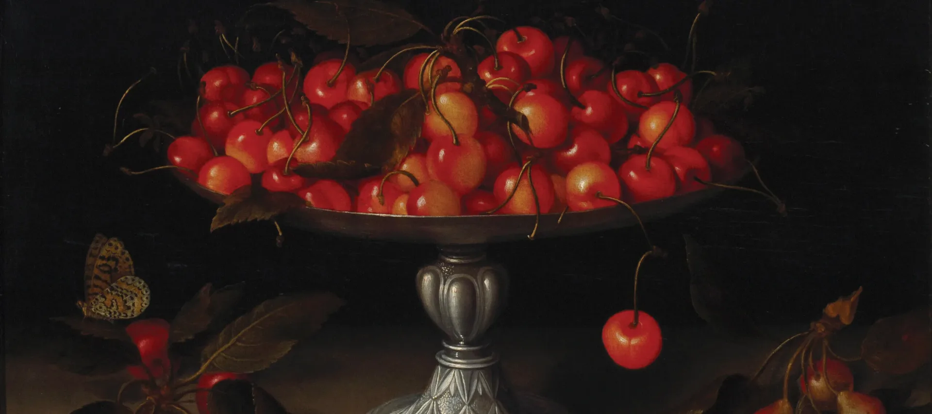 An opulent, footed silver bowl overflows with ripe cherries in front of a dramatic dark background. Additional fruits lie on the table below the bowl, and a butterfly flutters to one side.