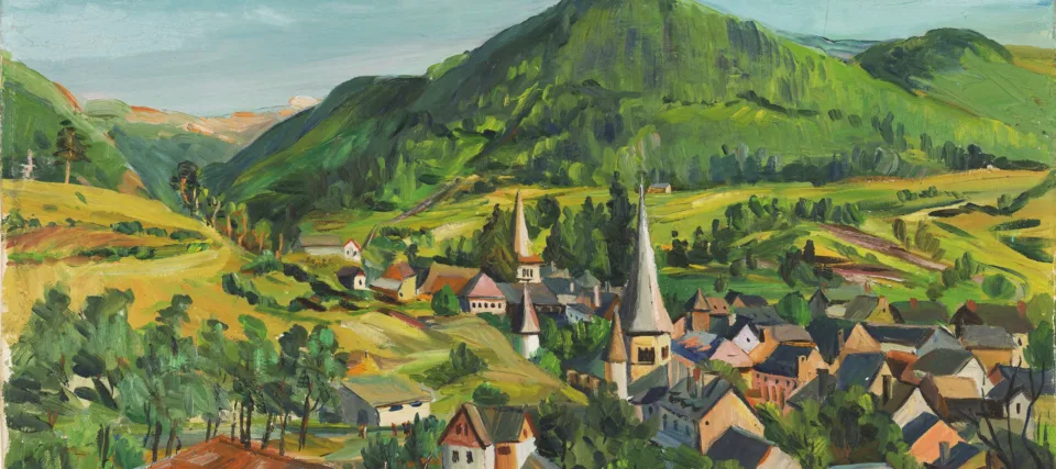 Beneath a soft blue sky, a picturesque village nestles in a valley between a river in the extreme foreground and verdant mountains. Combining loose and discrete brushstrokes with a palette of greens and golds, the painting recalls Paul Cézanne’s late 19th-century landscapes.