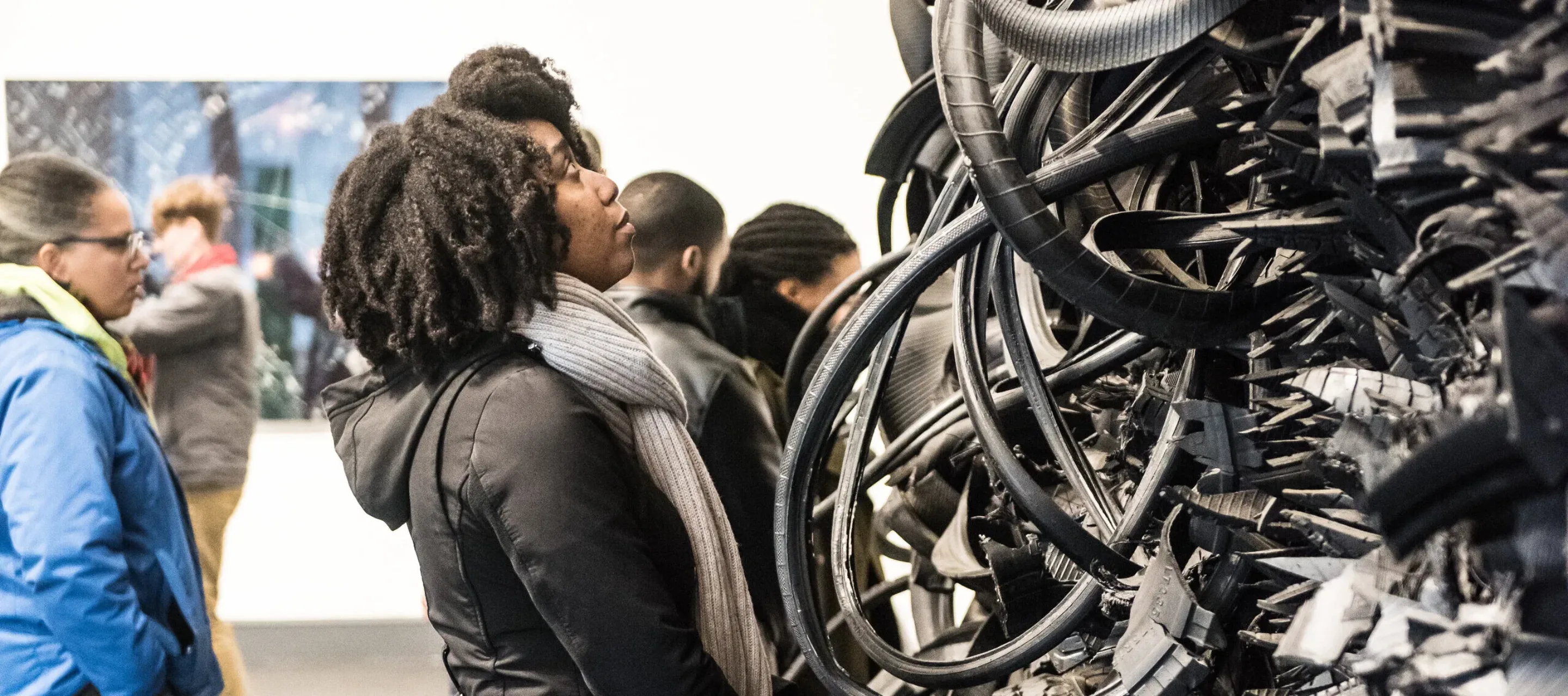 A woman looks closely at a large sculpture made of tires in a museum gallery.