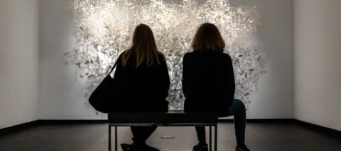 Two museum visitors sit on a bench and observe a brightly lit artwork in a modern gallery.
