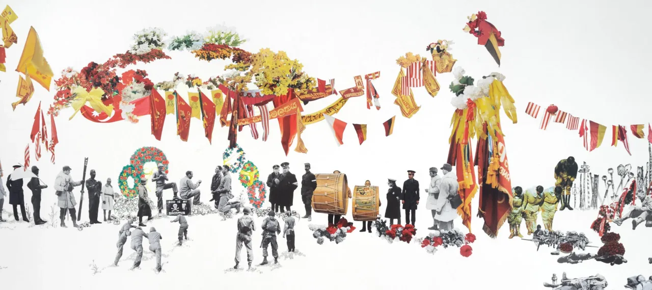 A long horizontal rectangle with small numerous figures and images collaged on the surface. Black and white figures in soldier’s uniforms stand and lay down, along with yellow and red banners, flags, and garlands.