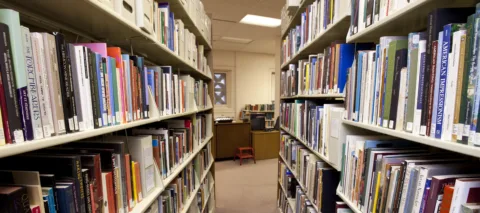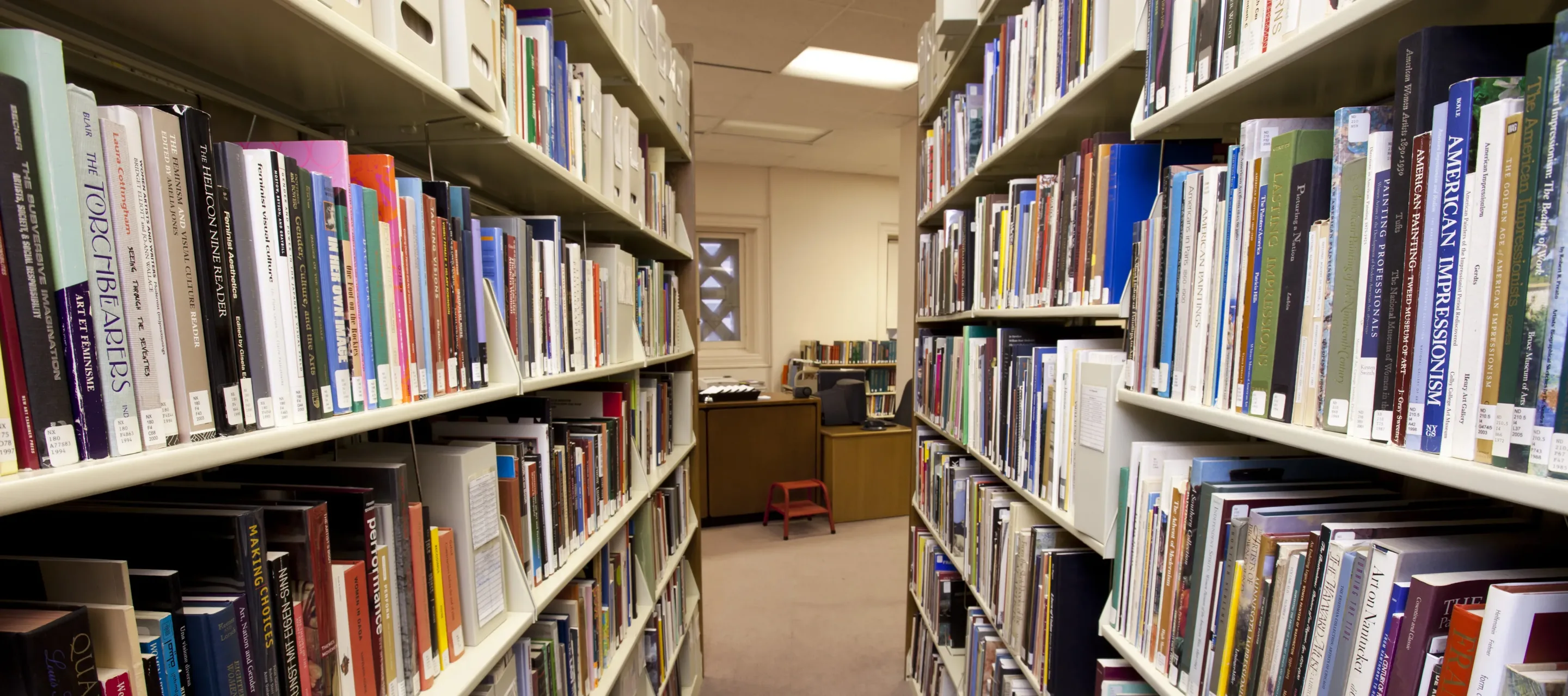 View of an aisle between two tall library bookshelves filled with multi-colored books. At the end of the aisle is a desk with a small orange footstool in front of it and a small bookshelf behind it.