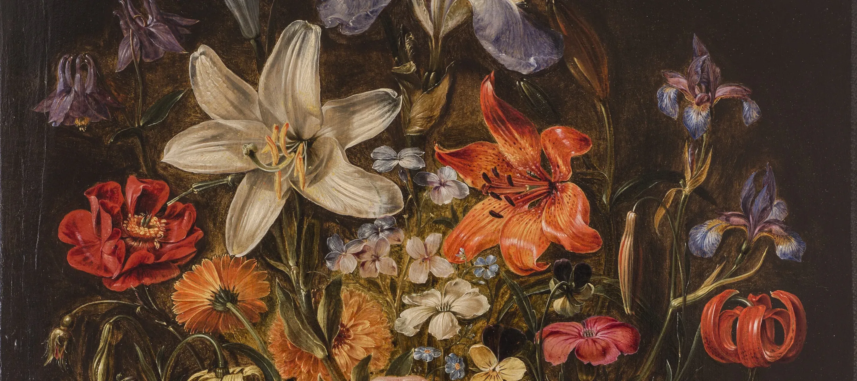 Realistic and detailed, the still life painting meticulously renders a variety of brightly colored flowers densely arranged in a dark round vase set against a dark background. The vase sits upon a stone ledge with two stray pink roses laying in the foreground.