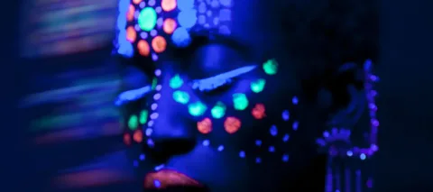 A dark-skinned woman stands in a dark space illuminated by a black light. Her face is painted with green, orange, and white dots and orange lipstick that all glow in the black light. She wears a beaded top and an earring with strands of beads that run from her earlobe to the top of her ear.