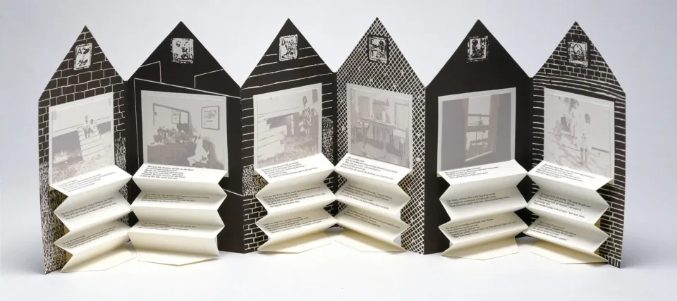 An open accordion-style book in the shape of a house. On each page is a black and white graphic background and a washed-out black and white photograph. Beneath each image is typed text on accordion folded paper.