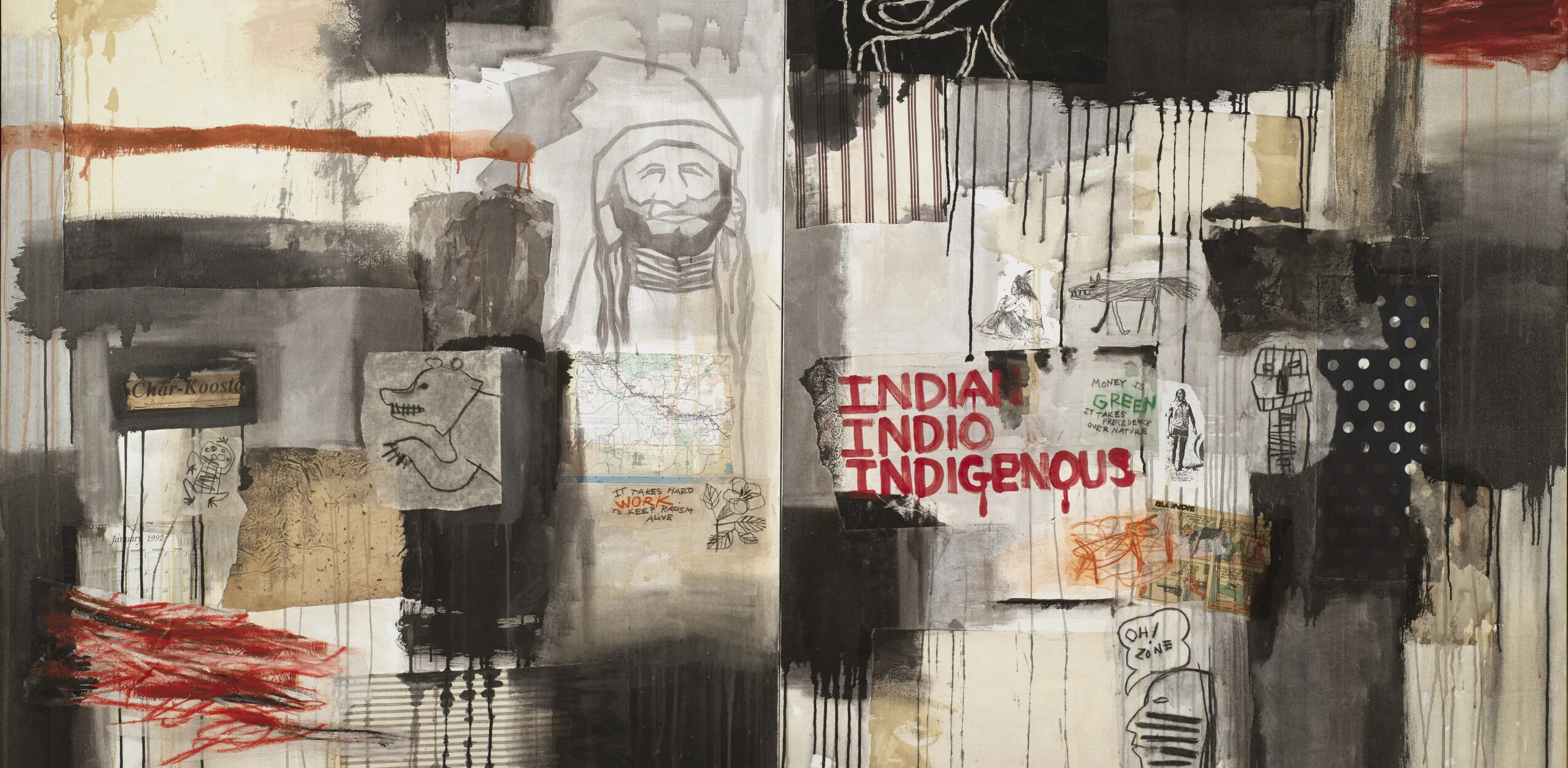 Jaune Quick-to-See Smith confronted subjects such as the destruction of the environment, governmental oppression of Indigenous cultures, and the pervasive myths of Euro-American cultural hegemony through a combination of representational and abstract images. Her politically charged and humorous imagery combines texts and popular culture alongside desert landscapes, horses, maps, and petroglyphs.