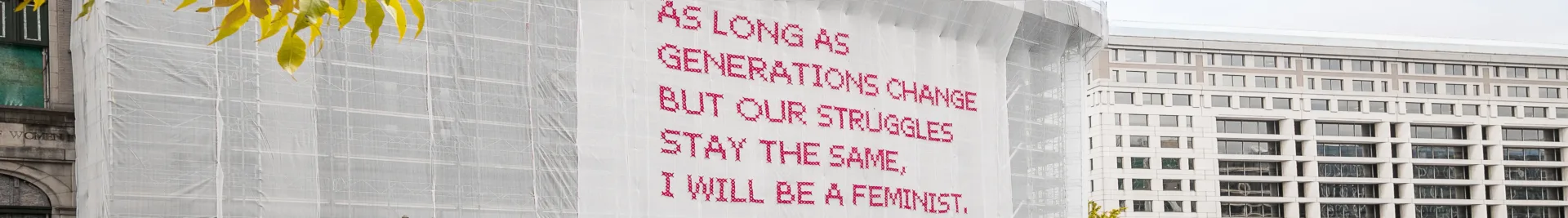 Hello, my name is Katharina Cibulka. I’m an Austrian artist, and I’m coming to Washington with my project, “SOLANGE,” which means “as long as” in English. We are installing our huge, hand-embroidered scaffolding net on this construction site. “SOLANGE” is a communicative art project that promotes dialogue. It aims to create awareness of gender inequalities people experience in our society.