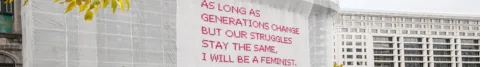 We begin by asking: “How much longer must we stand up for equality? How long will you be a feminist?” It is important for us to explore what issues are important to the communities that live, work, and interact around each site. With the National Museum of Women in the Arts, we conducted an online survey that asked members of the local community to share topics important to them. We received responses about issues like street harassment, bodily autonomy, equal representation in the arts, and every subject in between! From there, we explore the energy of the responses, twist and turn phrases, and add puns and ambiguities. It is an equally fun and demanding process. The final step is the installation and big reveal. The phrase remains a secret until it is unveiled on the site; no one outside the team and collaborative partner knows what themes or sentences we considered.